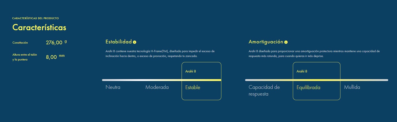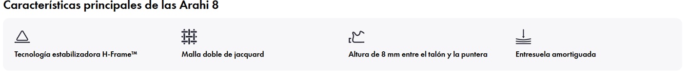 Lejos de ser unas zapatillas de estabilidad comunes, las Arahi 8 ofrecen una pisada segura gracias a sus materiales más suaves que su predecesora. El secreto reside en nuestra tecnología H-frame™ mejorada. Un estabilizador...