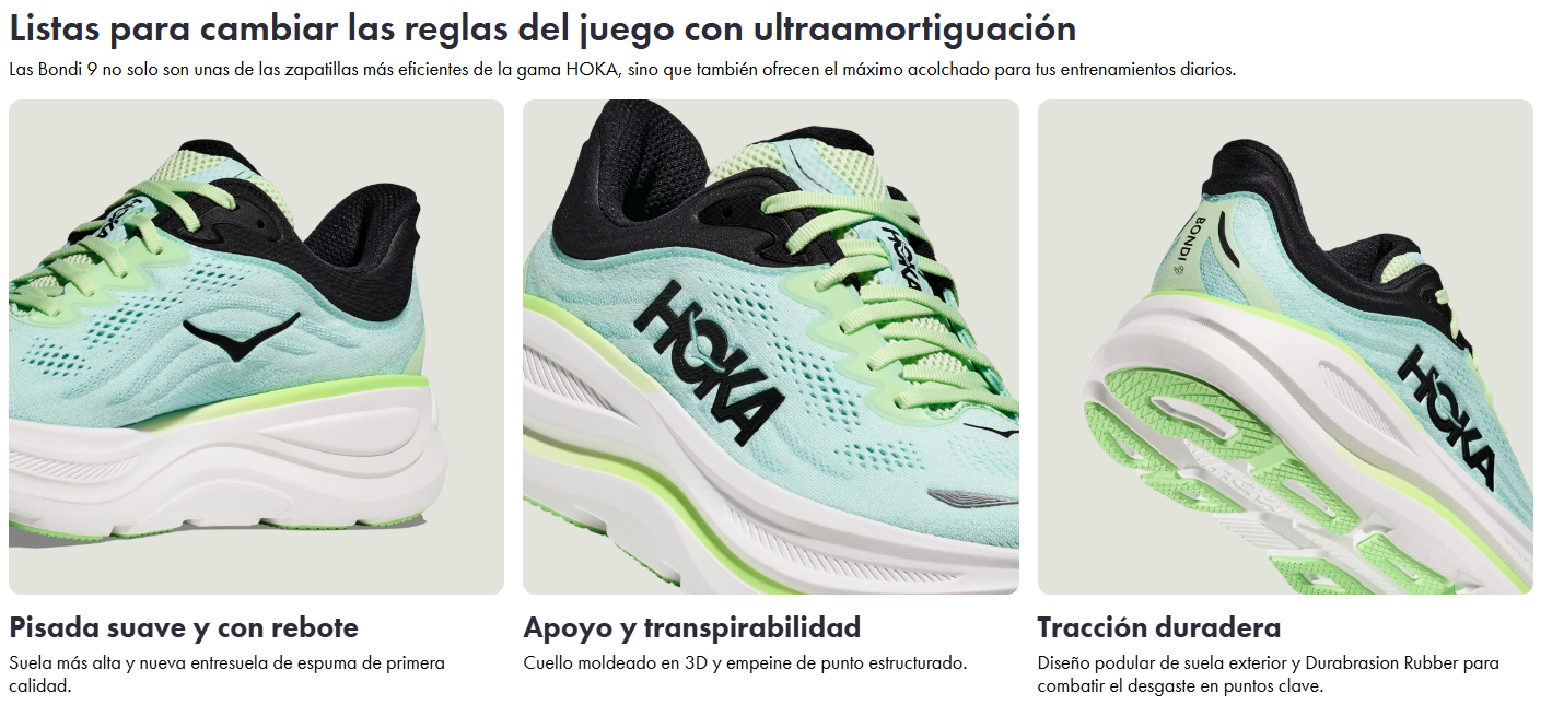 Listas para cambiar las reglas del juego con ultraamortiguación. Las Bondi 9 no solo son unas de las zapatillas más eficientes de la gama HOKA, sino que también ofrecen el máximo acolchado para tus entrenamientos diarios. Las hemos renovado por completo con actualizaciones como el aumento de la altura o una nueva entresuela de espuma de primera calidad para lograr esa pisada suave, así como resistente que caracteriza a las Bondi. Este modelo aumentado con ultraamortiguación cuenta ahora también con un cuello moldeado en 3D, así como con un empeine de punto estructurado con transpirabilidad zonal, y lo hemos rematado con Durabrasion Rubber para combatir el desgaste en puntos clave.