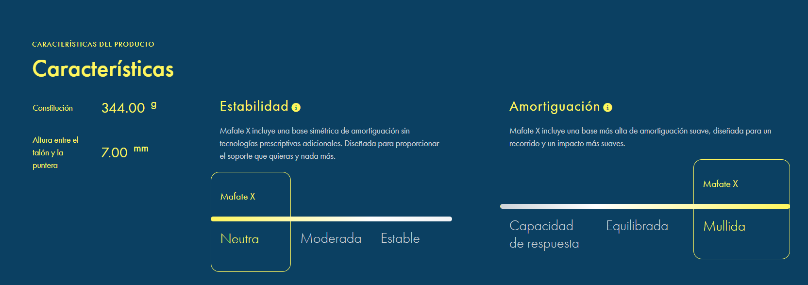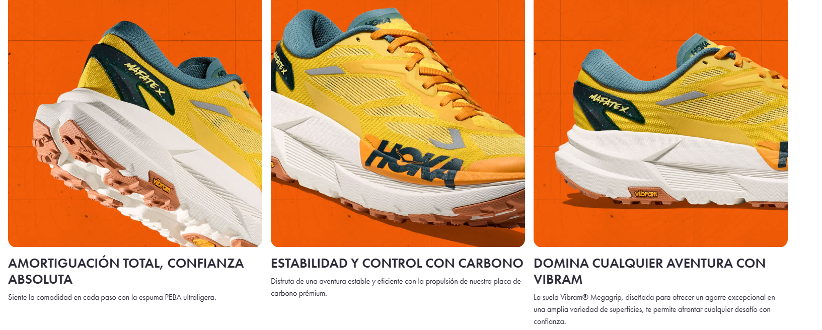 Máximo acolchado para las aventuras más exigentes. Ideales para quienes aman el trail, los senderos de grava y las carreras de ultrafondo. Abran paso al nuevo titán del trail. Las Mafate X, con un diseño para acompañarte en los mayores desafíos, ofrecen un excelente acolchado con un chasis de espuma de doble densidad, una capa superior de PEBA y mayor propulsión gracias a la placa de fibra de carbono bifurcada. Además, su empeine de tejido ultraligero facilita el drenaje, mientras que la suela Vibram® Megagrip con tacos garantiza una pisada suave en terrenos variables.